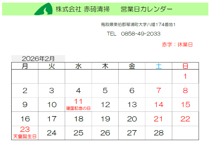 赤碕清掃 2026.2月 営業カレンダーPDF