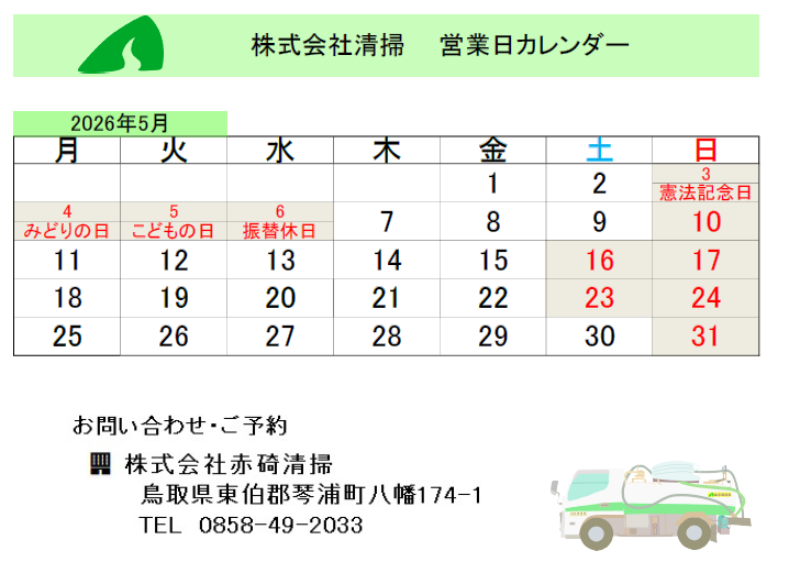 赤碕清掃 2026.5月 営業カレンダーPDF
