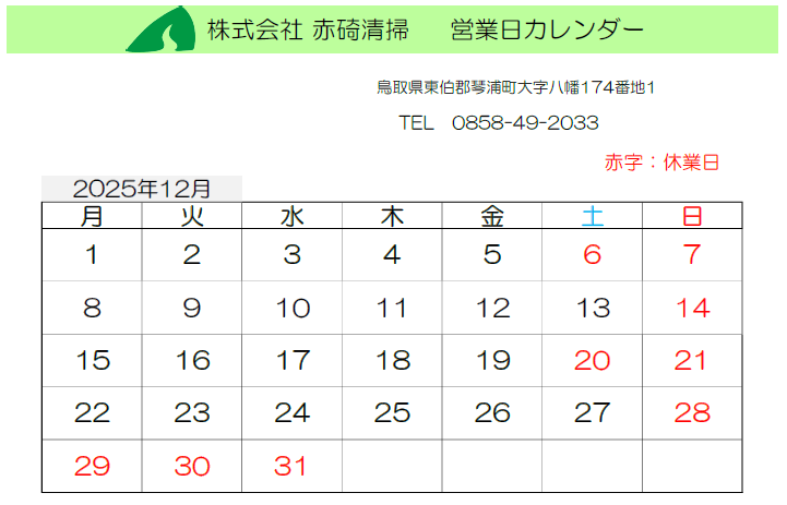 日頃よりご愛顧いただき誠にありがとうございます。 株式会社赤碕清掃の「12月の営業日」についてお知らせいたします。 下記、『赤碕清掃 2025.12月営業カレンダーPDF』 をダウンロードしてご利用ください。 ご不明な点がございましたらお気軽にお問い合わせください。